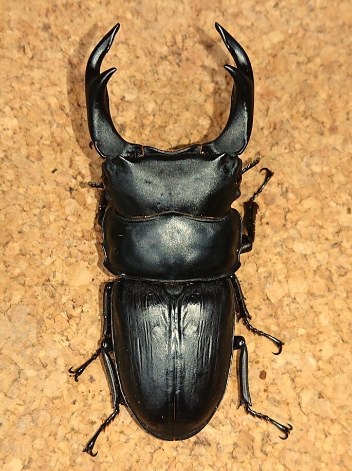 この血統は大型化するだけでなく、全体のバランスがとれた上で頭幅が広く大顎が短いという遺伝的特徴を持っていると思います。また、前胸がツヤ消しの個体が多いのが特色です。細かな温度調節をしないズボラな飼育でも♂の平均サイズは確実に80mmを越えますので、飼育方法によってはさらなる向上が見込めるでしょう。