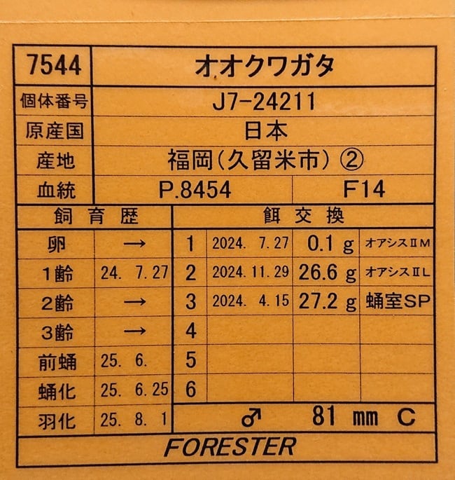 〇アウトライン交配であるため、一般的な表記は「CBF1」となりますが、私は野外個体からの累代数で表記しています。2025年羽化の個体は「F14」になります。