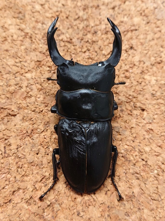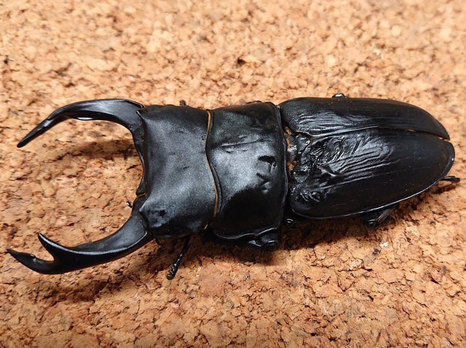 この血統は大型化するだけでなく、全体のバランスがとれた上で頭幅が広く大顎が短いという遺伝的特徴を持っていると思います。また、前胸がツヤ消しの個体が多いのが特色です。細かな温度調節をしないズボラな飼育でも♂の平均サイズは確実に80mmを越えますので、飼育方法によってはさらなる向上が見込めるでしょう。