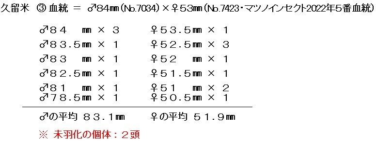 ♂83.5mm、♀51.5mm = 久留米2024年③血統(画像6枚目を御覧ください)